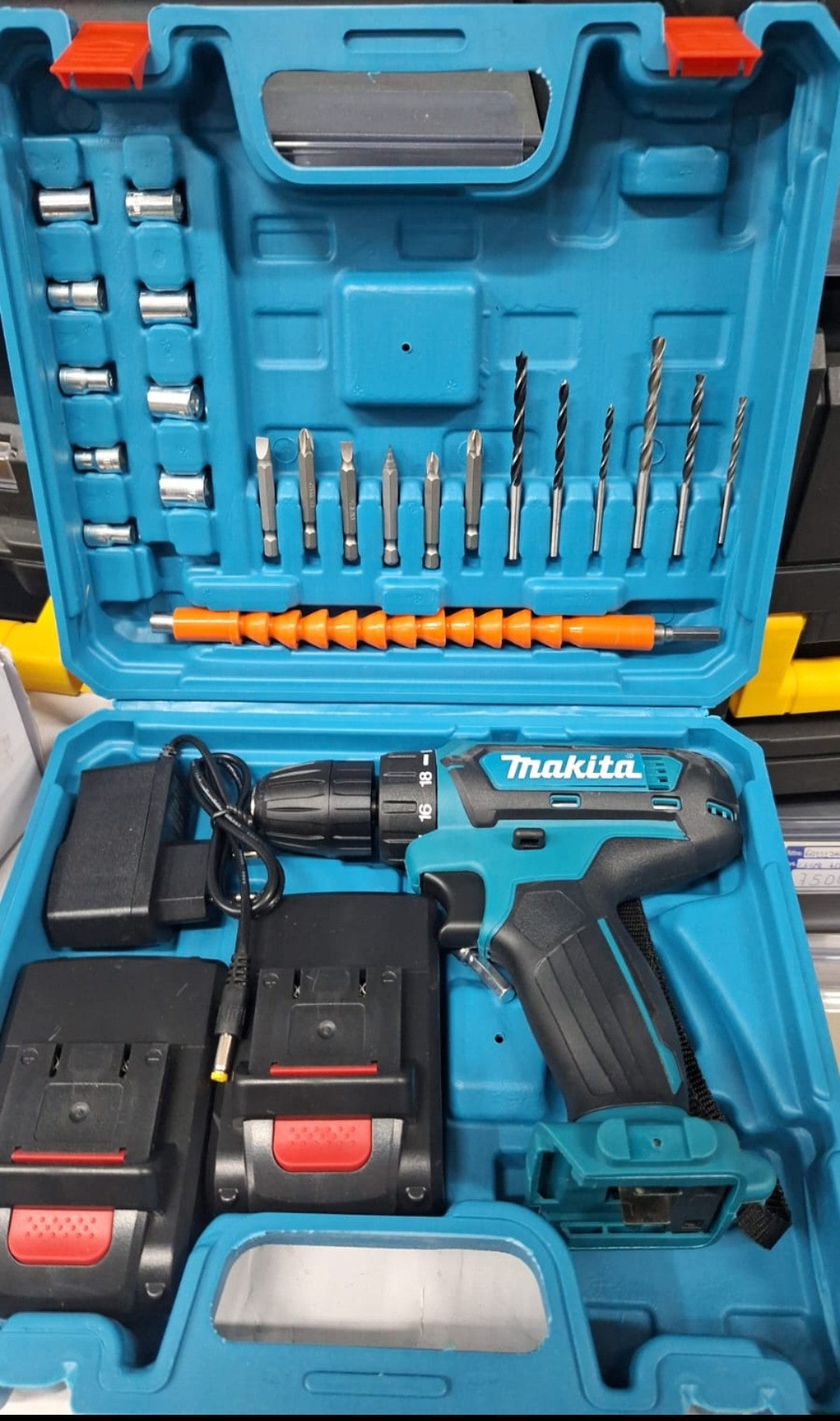 Paket uključuje: -Kofer -Akumulatorska bušilica -Punjač baterija -2 baterije -Alat sve u koferu